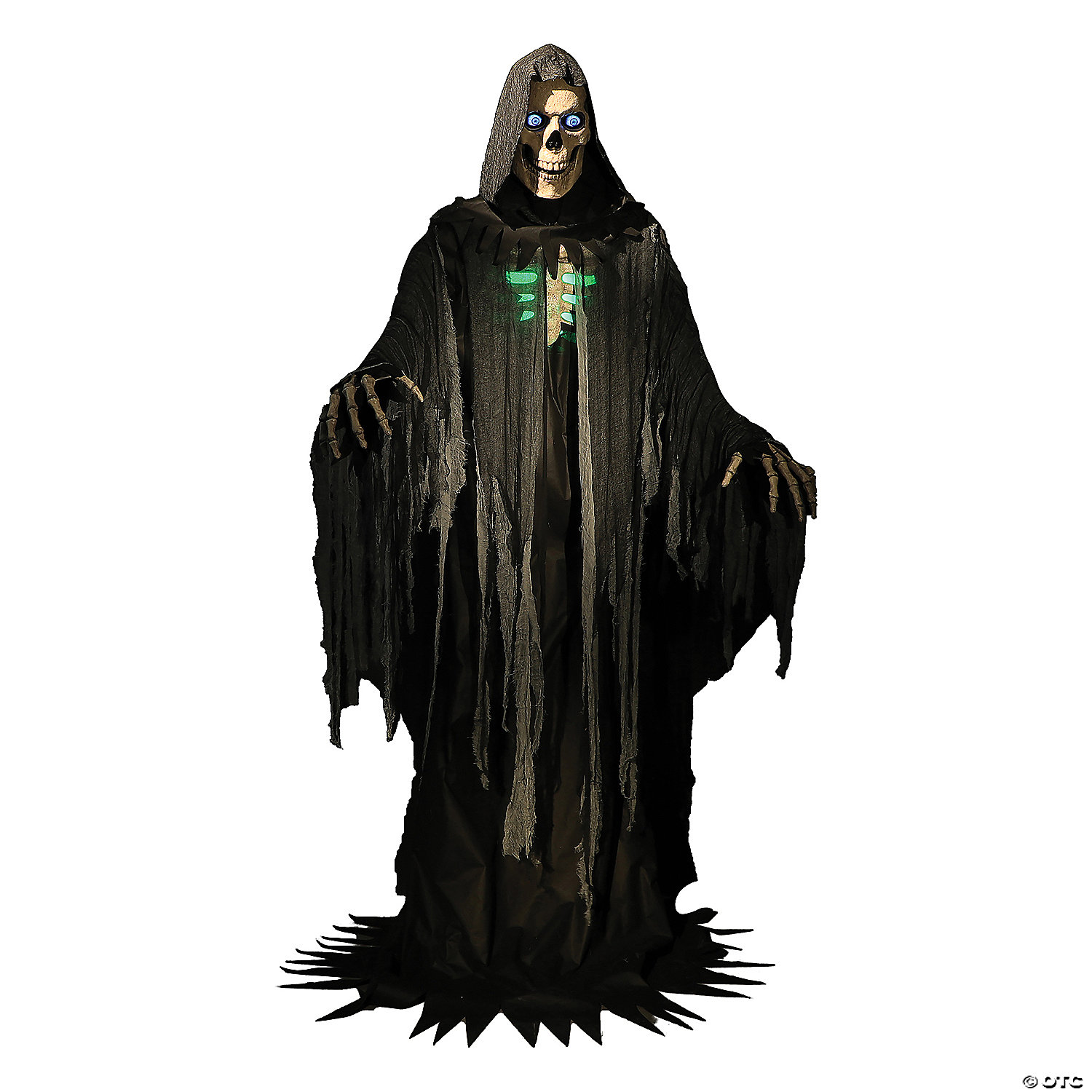 Add a real "Wow" factor to your haunted scene with this 10 foot tall Towering Reaper Animated Prop! The mood is set with the sighing, moaning wind in the background, as well as the eerie sounds of crows cawing, cats screeching, and owls hooting. His Turning Head and Moving Jaw are highlighted by his innovative Patented Digiteyes technology (Illuminated digital eyes that appear to look around and blink at you). The Reaper has a rich, deep persuasive voice that says his haunting phrases:Phrase #1: "Hahah welcome to the afterlife! Beware all ye who enter here."Phrase #2: "Go ahead and live a little, it is later than you think. I will be coming for you soon enough hahaha."Phrase #3: "Look who comes this way &ndash and I thought I was trouble hahaha! It is almost time for me to take another soul &ndash will it be yours?"Phrase #4: "Before you are doomed, save the last dance for me, hm? We'll dance our way to oblivion, you and I. "The Towering Reaper Animated Prop has a blow-molded head and hands, and his Chest Lights Up a glowing green. He has several Activation Options: Steady-on, Infra-red Sensor, or Step-here Pad. There is also a Volume Control that allows you to adjust according to your setting needs. Included is a Universal Adaptor with 4 interchangeable plugs, which works in USA, UK, Germany, and Australia.