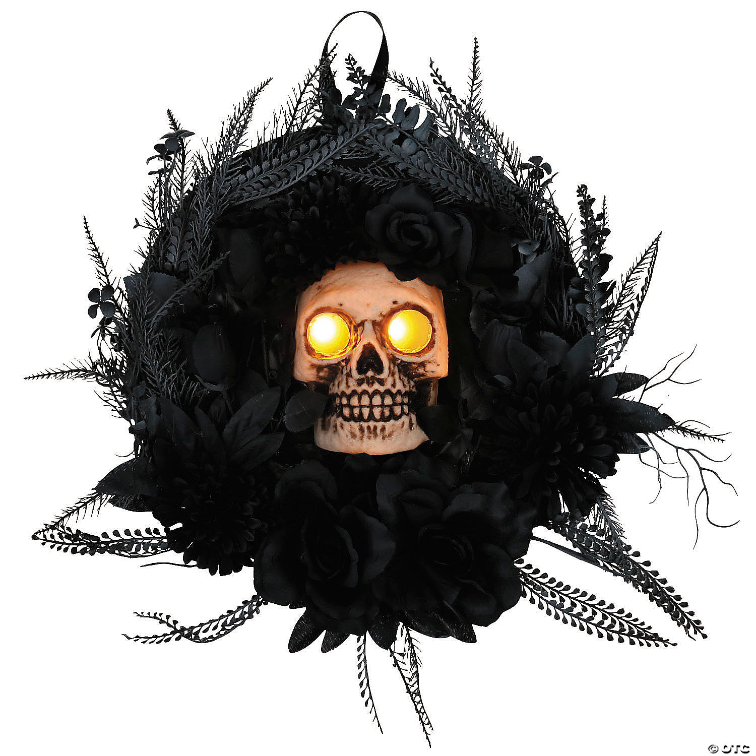 • SKULL WREATH: This Halloween decoration features black florals surrounding a light-up skull and includes sounds and a loop for hanging.• SHRIEK-WORTHY ENTRYWAY DECOR: Place Halloween-themed decorations near your entrance to create a welcoming and festive atmosphere for guests and trick-or-treaters.
