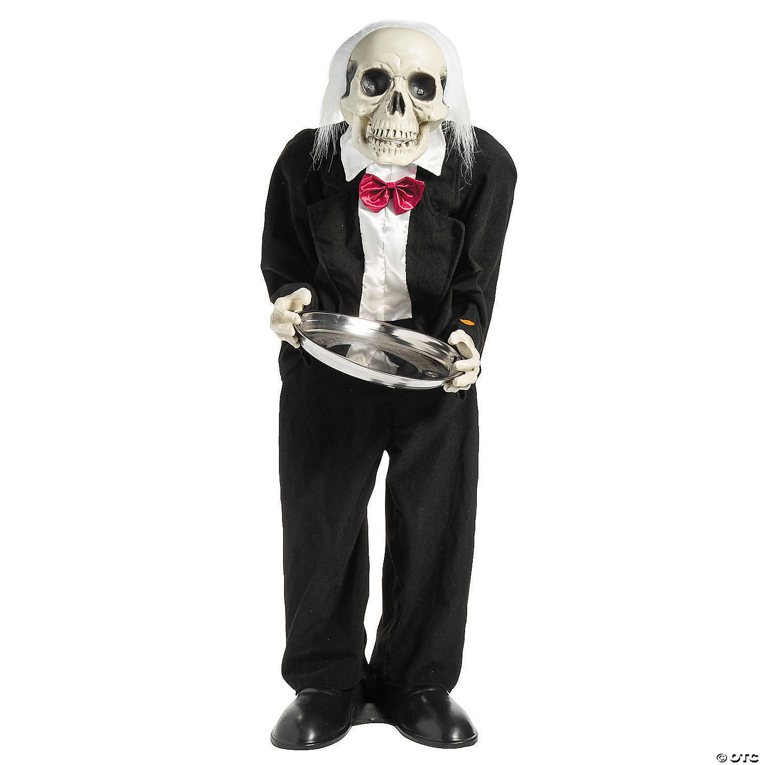 • SKELETON THEME: This standing butler features a skeleton hands and face along with a shock of white hair. The skeleton is dressed as a butler in a black suit and holding a silver platter in its hands.