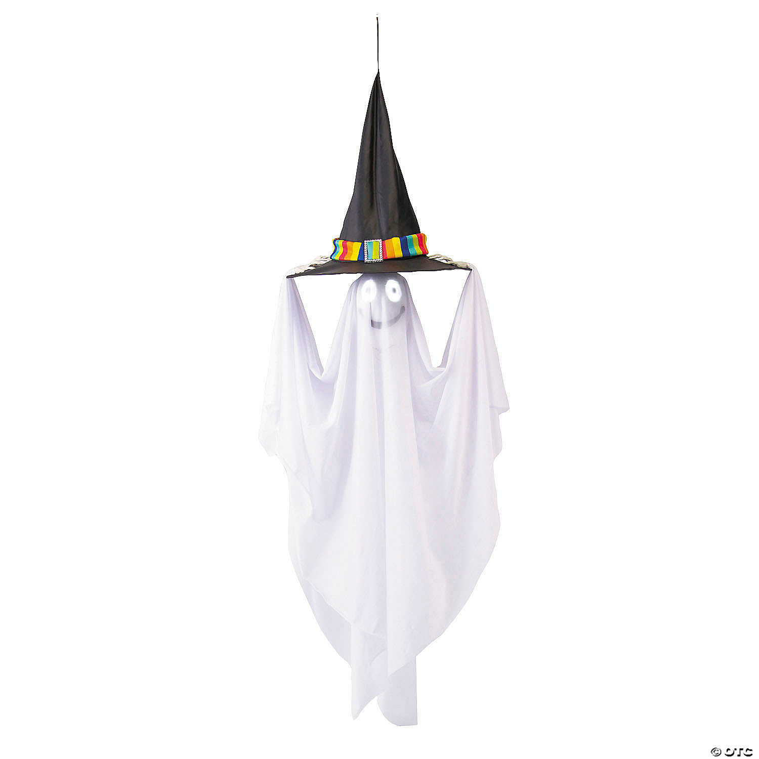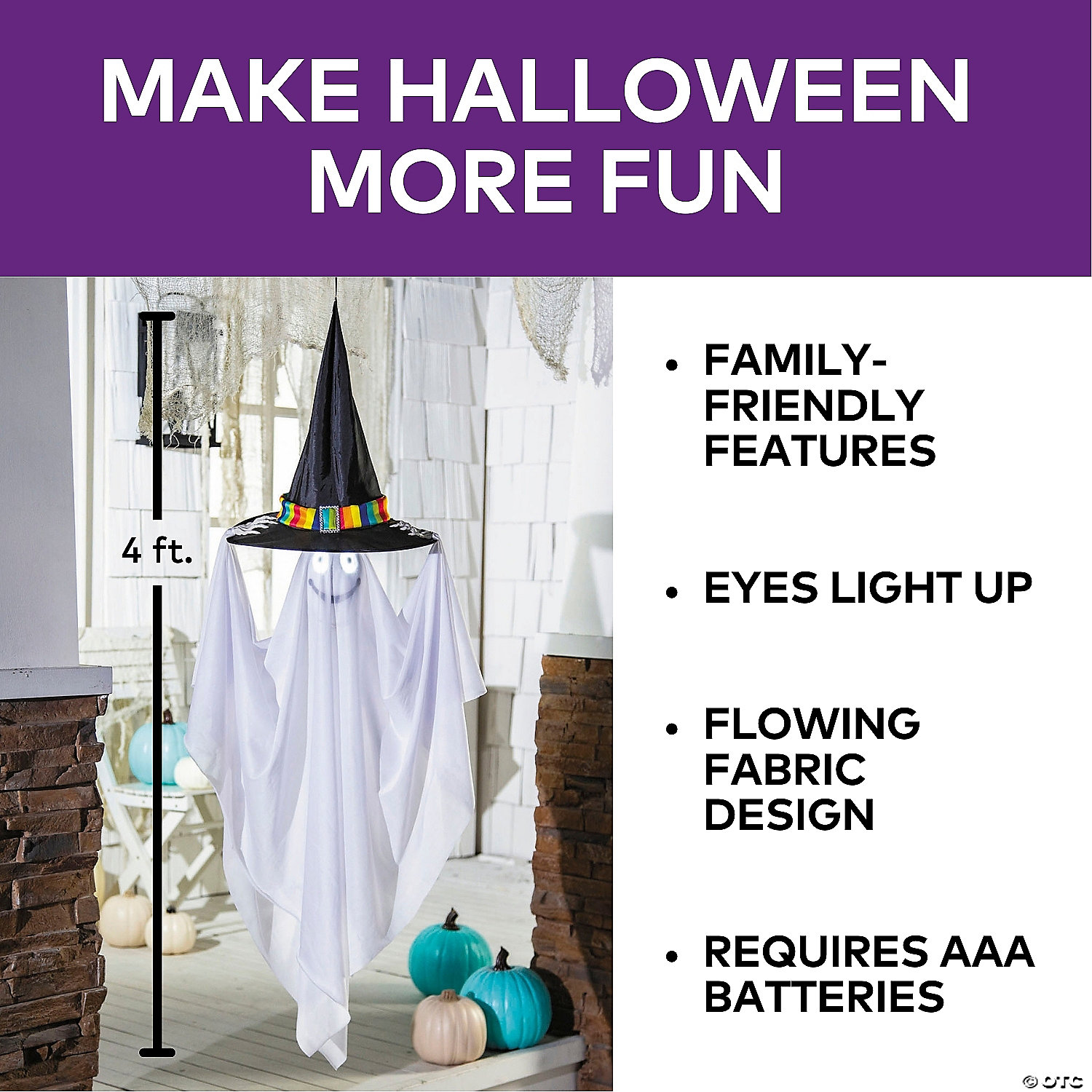Encourage smiles in your Halloween haunt! This floating ghost decoration includes cord for hanging and features a smiling face with light-up eyes, has a sheer white, draped fabric body and is holding over its head a black witch hat with multicolor band and buckle above the brim. Show off the lighter side of Halloween thrills for trick-or-treaters and party guests with this ghost decoration. Requires 3 AAA batteries, not included.