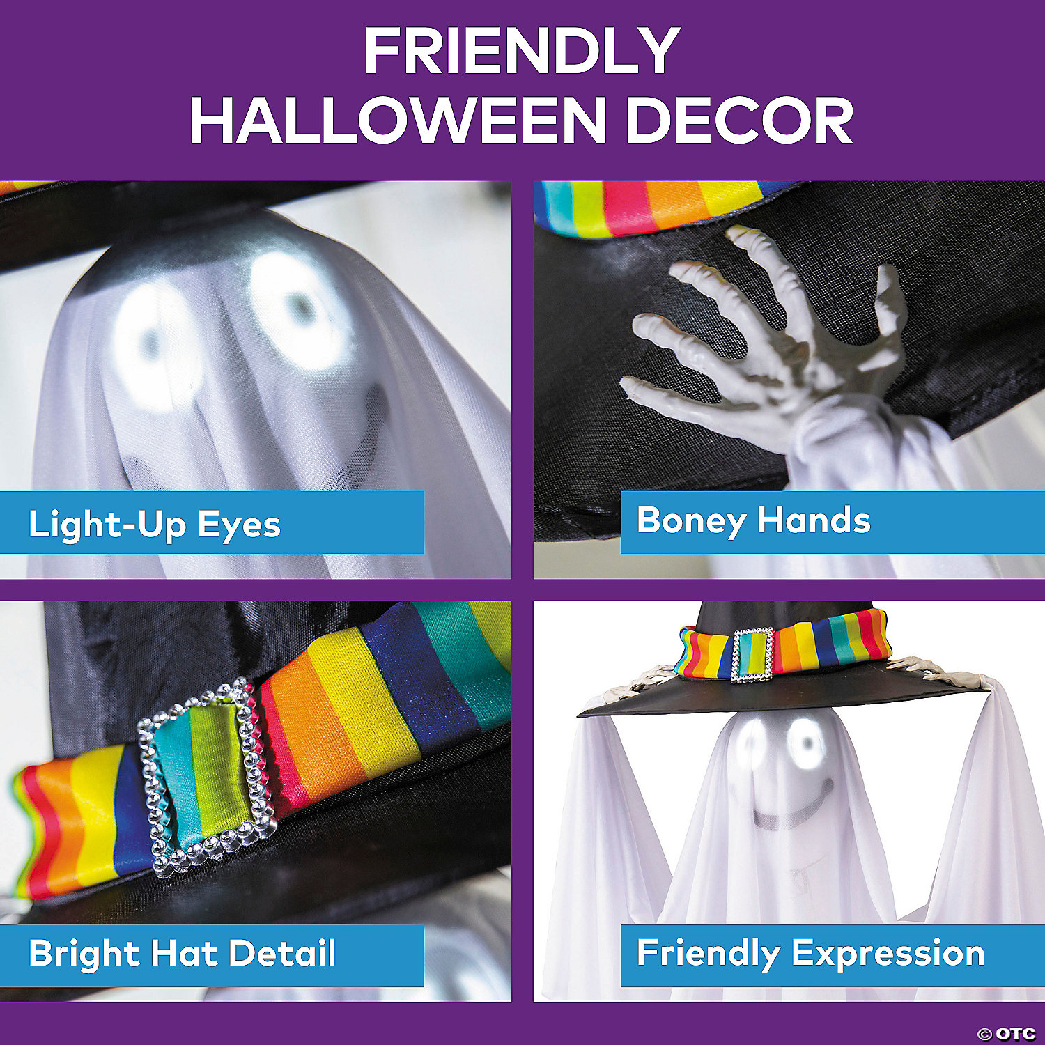 • GHOST WITH WITCH HAT: This friendly ghost features a draped, white fabric piece for the body, light-up eyes and smiling mouth and is holding a witch hat above its head that is black and includes a colorful band.