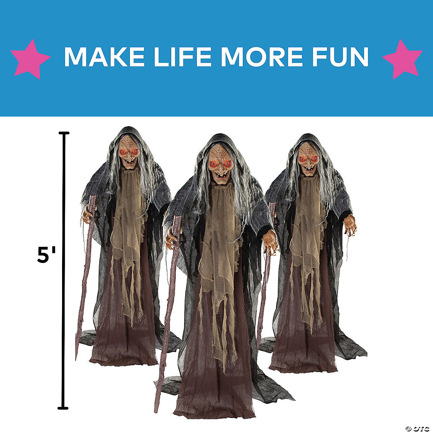 Freak out your trick-or-treaters when they visit your house this Halloween! This set of life-sized witch decorations look like aged, crouched hags holding their canes. And they move—just enough to frighten people! Trick-or-treaters and Halloween party guests will think their eyes are tricking them when they spy the witch’s movements. Add to your Halloween decor for some spooky fun! Hands, face and base, plastic. Back of head is rounded. Clothing, polyester. 5 ft. Each witch requires 3 "AA" batteries, not included.