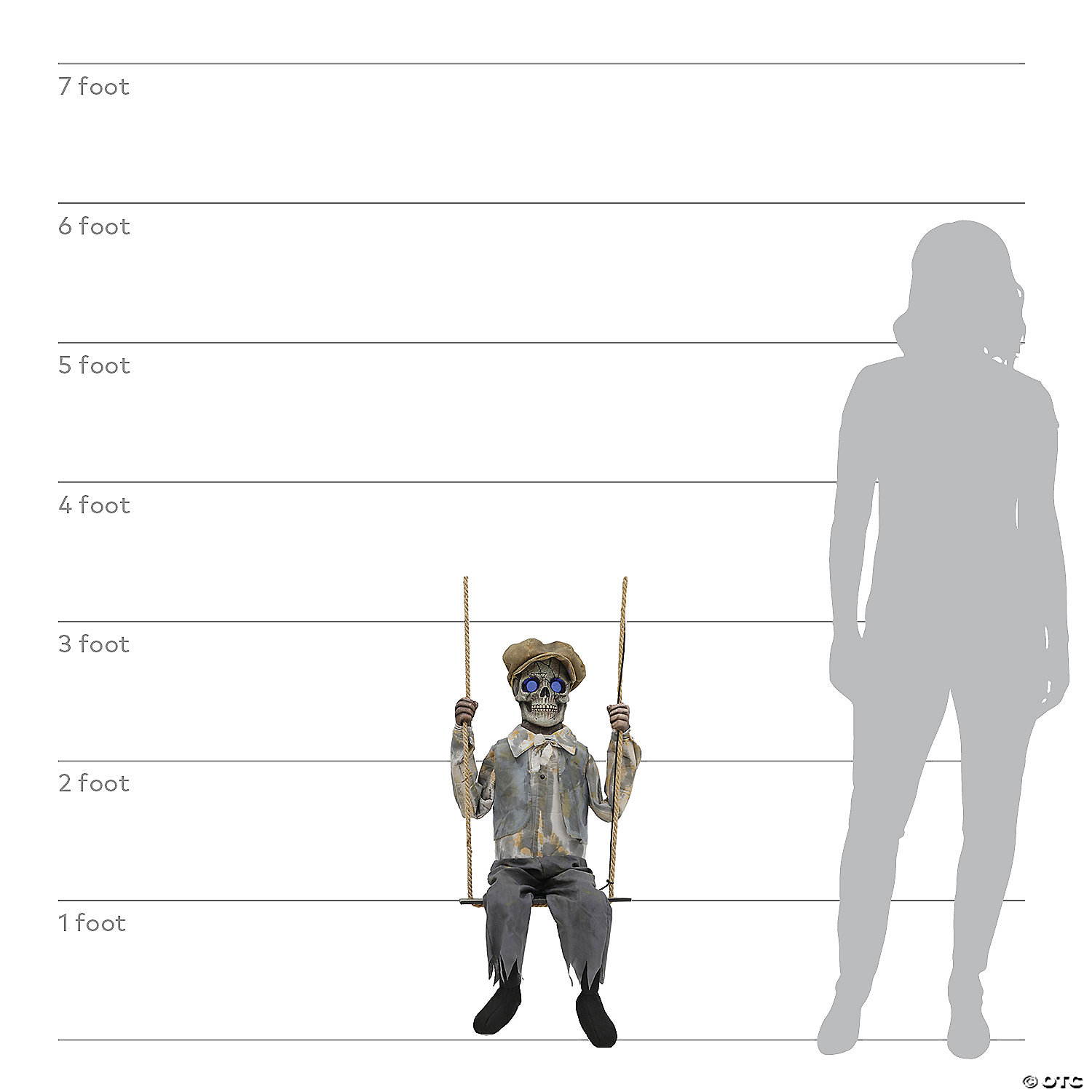 Everyone will be afraid to come up to your house with the Swinging Skeletal Boy around! This creepy prop features a Victorian-era skeletal boy with hollowed out eyes that glow an other-worldly blue and speaks haunting phrases to all passersby as his head turns side-to-side while he swings back and forth on his swing. Your haunted house will never be the same with the Swinging Skeletal Boy! Animation: Eyes glow blue Head turns side-to-side Swings back and forth on swing. Phrases prop says: inchesHello. Do you want to play? I've been swinging here waiting for you, for years and years. You have such nice skin...can I have it? (giggle) That's okay, I'll come get it when you're sleeping. I'll make you one of us, then you can swing forever too (giggle)! inches, inchesOne, two, I'm a you, Three, four, breaking down your door, Five, six, beware of my tricks, Seven, eight, you will not escape, Nine, ten, this will never end! (Giggle) inches. Activation options: Steady-on, Infra-red sensor (works up to 6.5' feet away & works in all lighting conditions), Step-here pad (included). Power: UL power adapter that plugs into any standard outlet. Materials: Polyester, PVC, sponge, plastic, hemp rope, electronics. Assembly required. Fixed height 62 inches, width 16 inches, animation right to 50 inches, depth 18 inchesSpecial Shipping Information: This item ships separately from other items in your order. This item cannot ship to a P.O. Box. This item may be subject to additional processing days.ITEM IS NOT ELIGIBLE FOR EXPEDITED SHIPPING