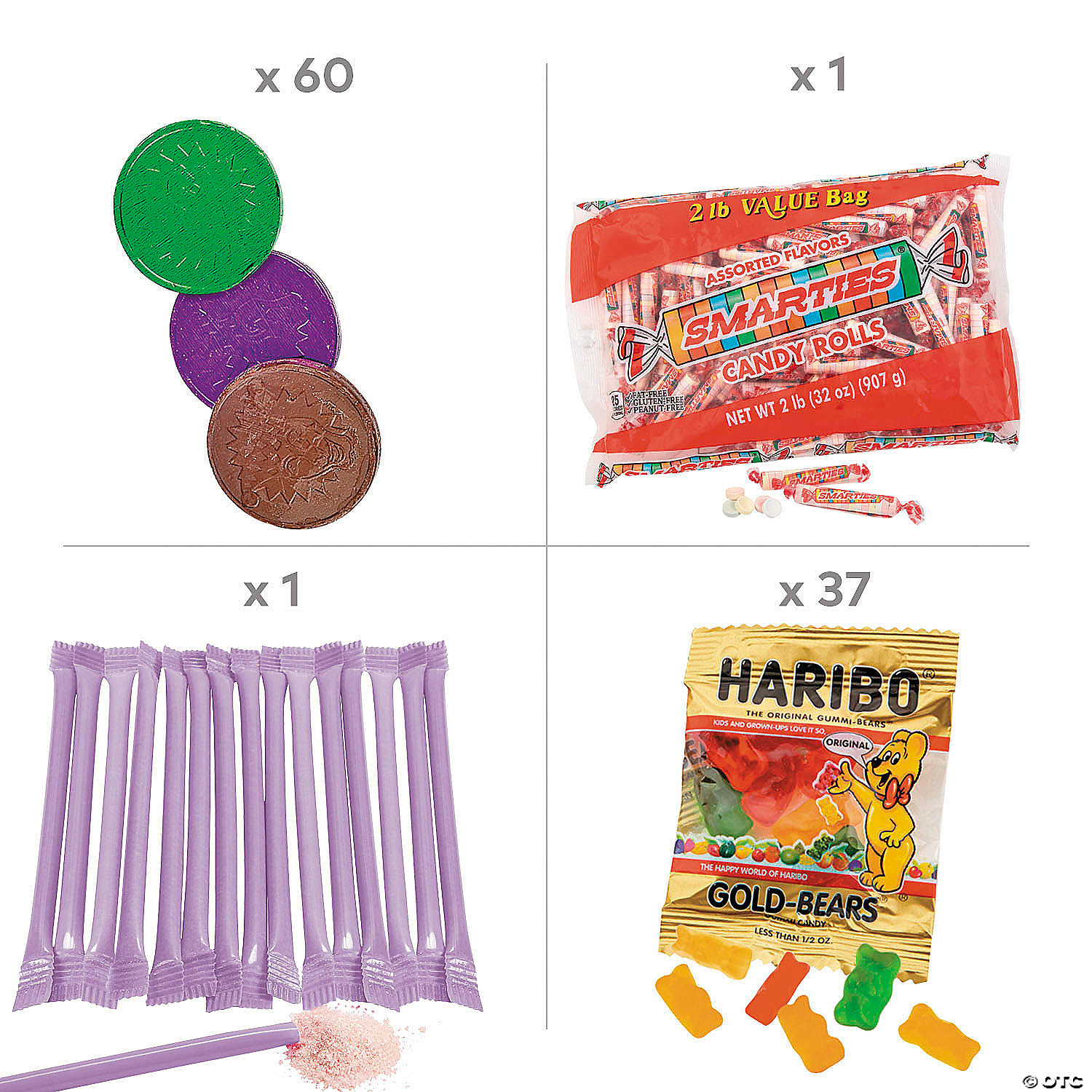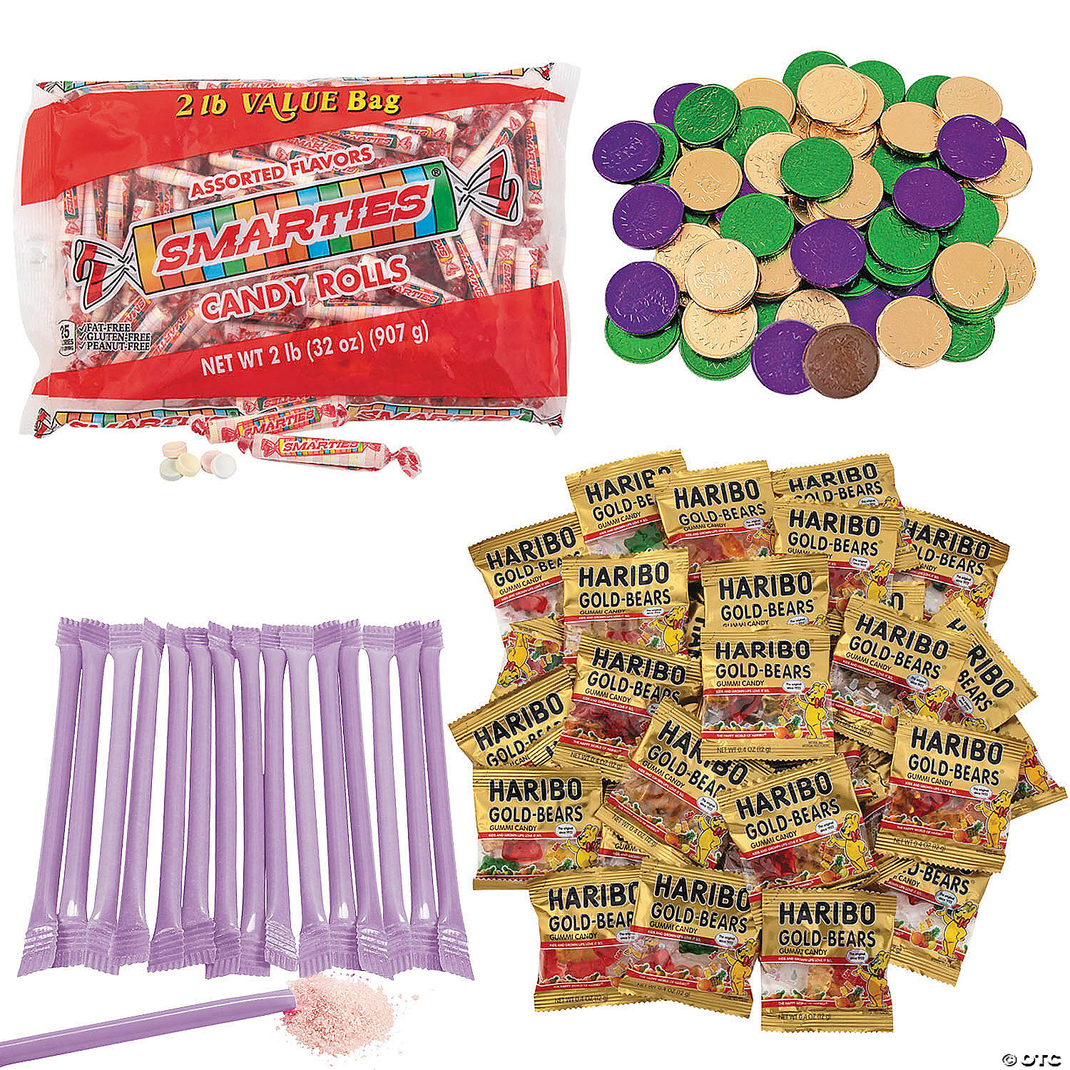 Hand out some smiles with this candy mix that appeals to all ages! This Mardi Gras assortment will liven up the party and provide you the perfect options for a candy buffet or giveaways at your celebration. Give guests some yummy fun with this bulk buy of sweet treats. (512 pcs./unit) Candy is non-returnable. For more information, visit our "Return Policy" page located on our website. Ingredient, nutrition, allergen and other product information are provided on our Web and Mobile sites for reference purpose only, without warranty or representation as to accuracy. Manufacturers adjust their labeling regularly and are solely responsible for the accuracy of the information. For general questions concerning these items, please contact our customer service at 800-228-0475.Includes:• 75-pc. Green Dum Dums® Solid Color Lollipops (Total wt., 12 oz. Sour apple flavor. Individually wrapped. Fat-free. Gluten-free. Dairy-free. Kosher. Nut-free.)• 37 Haribo® Gummi-Bears® Mini Packs (Total wt. 15 oz. Assorted fruit flavors. Fat-free.)• 145-pc. Bulk Laffy Taffy® Grape Mini Bar Tub (Total wt., 49.3 oz. Grape flavor. Individually wrapped.)• 60-pc. Mardi Gras Chocolate Coins (Total wt., 1 lb. Individually foil-wrapped. Assorted green, gold and purple.)• 75-pc. Purple Dum Dums® Solid Color Lollipops (Total wt., 12 oz. Grape flavor. Individually wrapped. Fat-free. Gluten-free. Dairy-free. Kosher. Nut-free.)• 120 Smarties® Roll Candies (Total wt., 2 lbs. Each roll has 15 assorted flavor candy pieces. Dairy-free. Fat-free. Gluten-free.)• Assortments are subject to change at any time and may vary from picture shown. Substituted items will be similar in nature.
