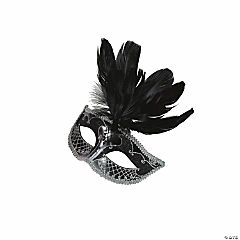 Adults Black Plastic Carnival Mask with Jewel & Feathers - One Size