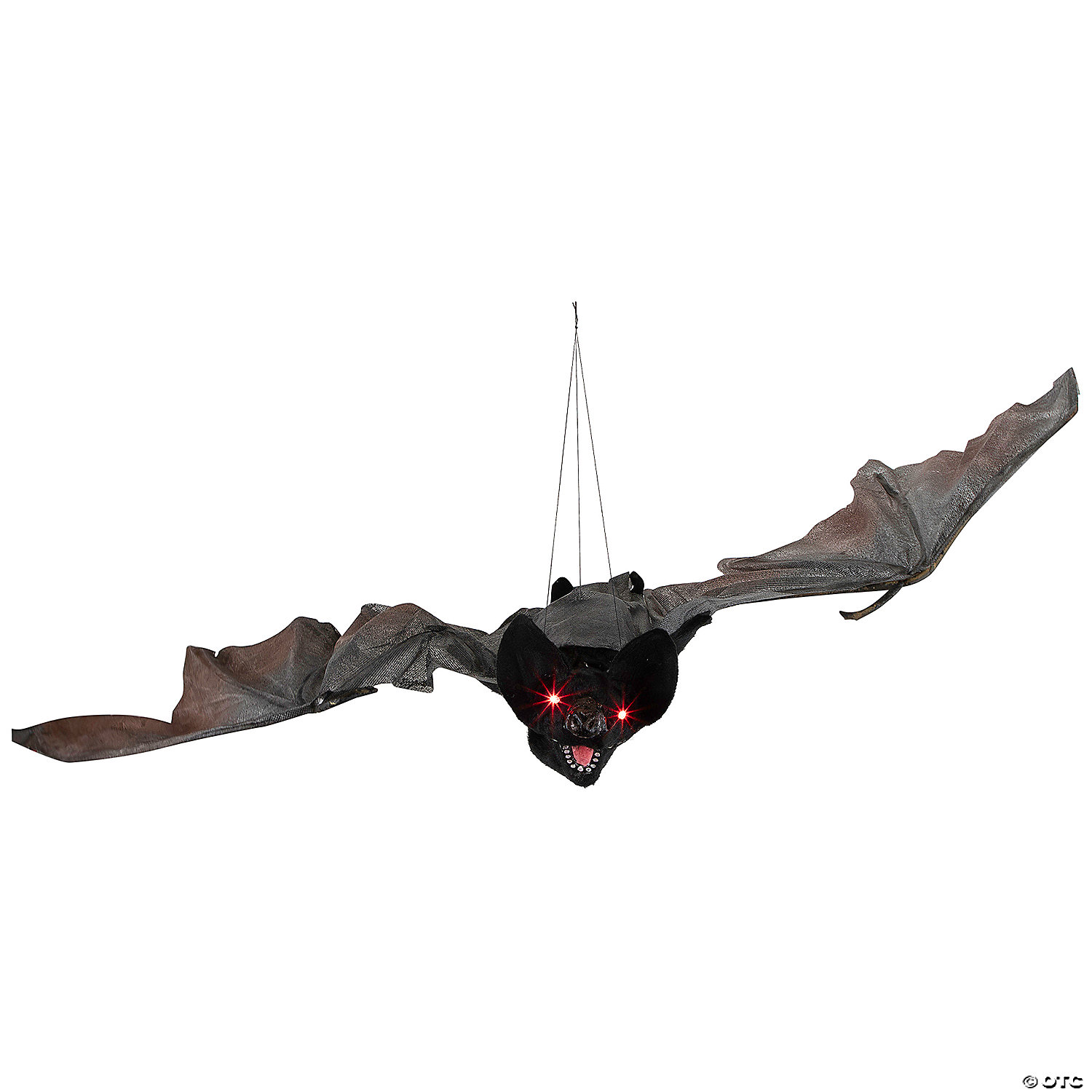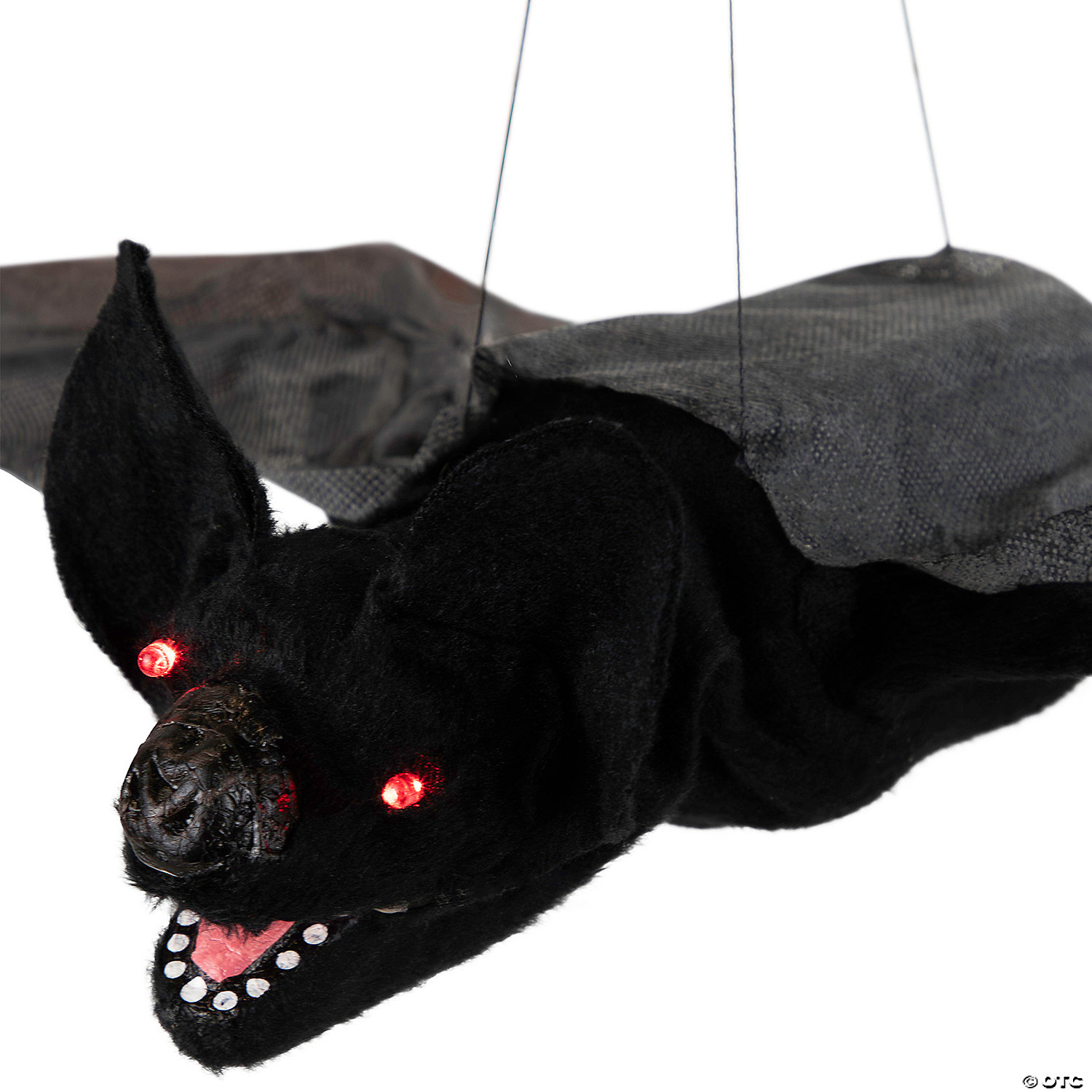 Bring your haunted house to life with this LED lighted and animated Halloween bat with moving wings—a thrilling addition to your spooky seasonal décor! Designed to create spine-tingling excitement this eerie Halloween bat features glowing red LED eyes moving head and flapping wings that mimic a bat in mid-flight. As it comes to life it emits eerie haunting sounds that are perfect for setting the mood on Halloween night. Whether you're decorating your home porch or Halloween party this animated Halloween bat decoration is sure to make a chilling impact. The realistic motion and sound effects will startle trick-or-treaters and delight Halloween enthusiasts. Its lightweight construction makes it easy to hang indoors or in a covered outdoor space for maximum fright effect. This motion-activated bat prop is ideal for haunted houses front yard displays or as a standout piece in your Halloween setup. With lifelike movement creepy audio and bright LED lights this animated bat creates a ghoulish atmosphere that's sure to impress guests and passersby. If you're looking to take your Halloween decorations to the next level this light-up flapping bat with spooky sounds is a must-have addition to your fright night display. Product Features: Wings flap and head moves when turned on. Eyes light up and flash red. Makes eerie shrieking sounds. Requires 3 "AA" batteries - not included. Convenient on/off switch Dimensions: 6"H x 48"W x 15"D. Material(s): polyester/plastic/iron/styrofoam Special Shipping Information: Item ships separately from other items in your order and may be subject to additional processing days. Item cannot ship to a P.O. Box, APO, FPO or PPO. Item is not eligible for expedited or international shipping. You may initiate a return for unused items within 30 days, if the items are in original packaging with all original materials included with the shipment.